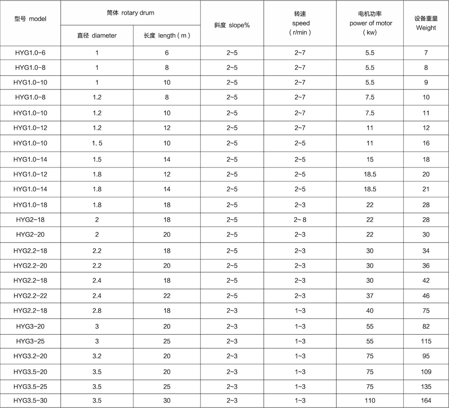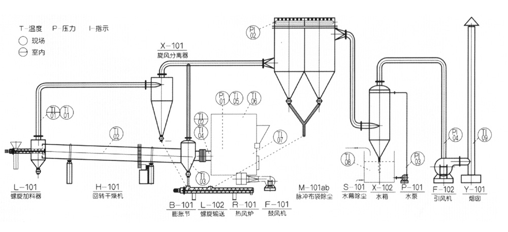 如圖所示,需干燥的濕物料經過螺旋傳送機送到HYG干燥機的進料箱后進入轉筒內,轉筒為一稍傾斜的圓筒。物料與載熱體在筒內通過抄板的作用充分接觸,該接觸方式根據物料的特性有逆流接觸和并流接觸。隨著筒體的轉動,物料在重力作用下移動到較低的一端,濕物料在移動過程中,從載熱體吸收熱量,使水份蒸發而得以干燥。隨后經出料箱出料。載熱體吸收水份后作為尾氣排出筒體。尾氣排入大氣前,可經除塵裝置除塵后排定。根據對尾氣含塵量的要求不同,可選擇對除塵設備的配置組合。(如要求較低含塵量,可將尾氣先經旋風除塵器處理,再經脈沖袋式除塵器或水幕除塵器進一步處理后排空)。