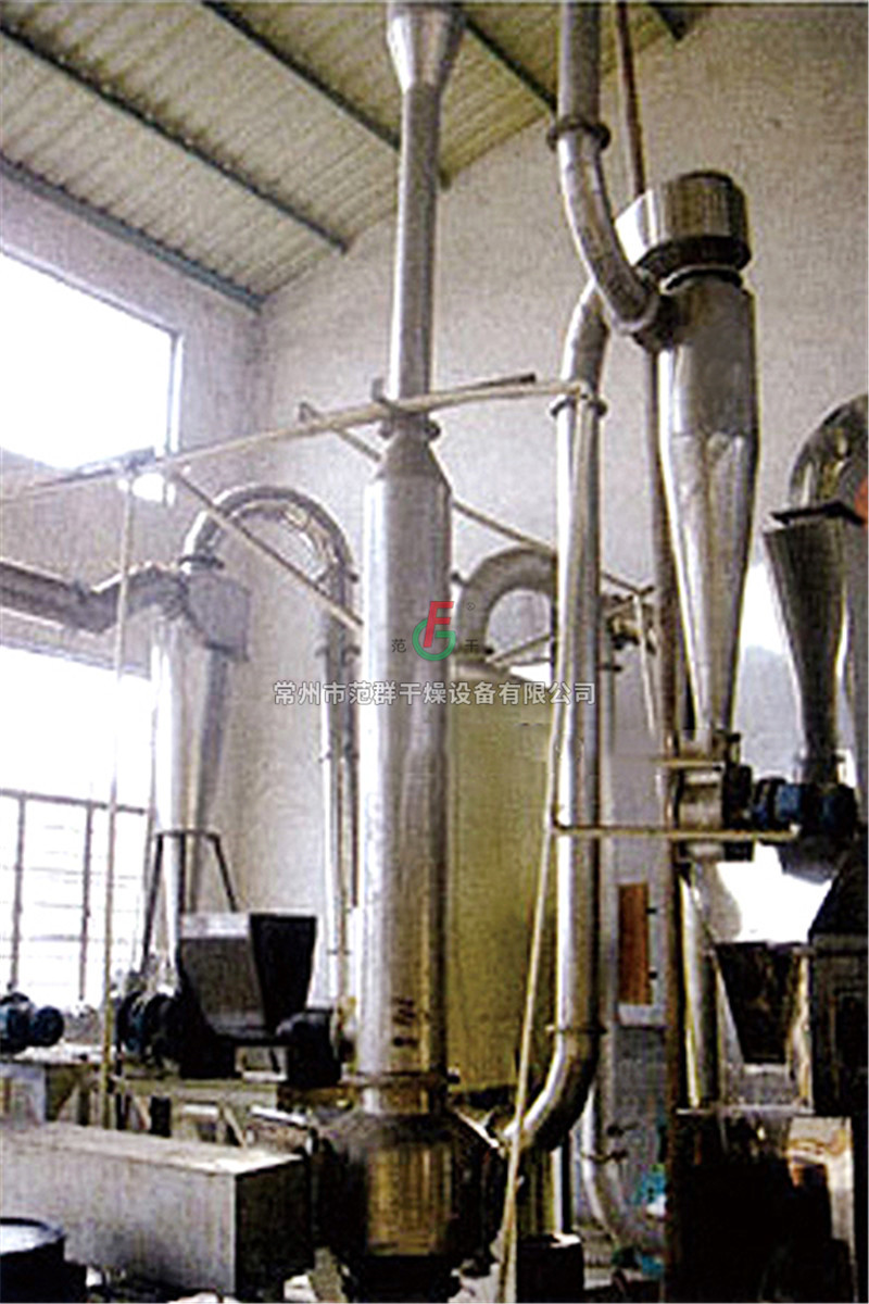 濕物料經輸送機與加熱后的自然空氣同時進入干燥器,二者充分混和,由于熱質交換面積大,從而在很短的時間內達到蒸發干燥的目的。干燥后的成品從旋風分離器排出,一小部飛粉由旋風除塵器或布袋除塵器得到回收利用。Q型氣流干燥器是負壓操作,物料不經過風機;QG型氣流干燥器是正壓操作;物料經過風機帶有粉碎作用;FG型氣流干燥器是尾氣循環型;JG型氣流干燥器是強化型氣流干燥器,其集閃蒸干燥與氣流干燥為一體,是我公司根據用戶要求設計的新型干燥設備。