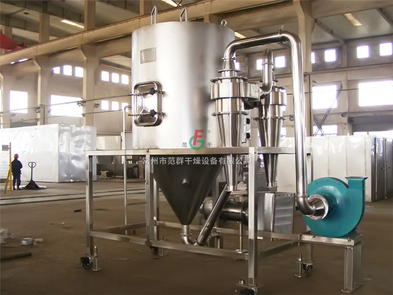 空氣通過加熱器轉(zhuǎn)化為熱空氣,進(jìn)入裝置在干燥室頂部的熱風(fēng)分配器,然后均勻的進(jìn)入干燥室,同時通過無級調(diào)速的螺桿泵將料液送至裝置在干燥室頂部的離心霧化器,使料液霧化成極小的霧化液滴,料液和熱空氣并流接觸,水份迅速蒸發(fā)在極短的時間內(nèi)干燥為成品,成品經(jīng)干燥塔底部和旋風(fēng)分離器排出,廢氣由風(fēng)機(jī)抽出排空。