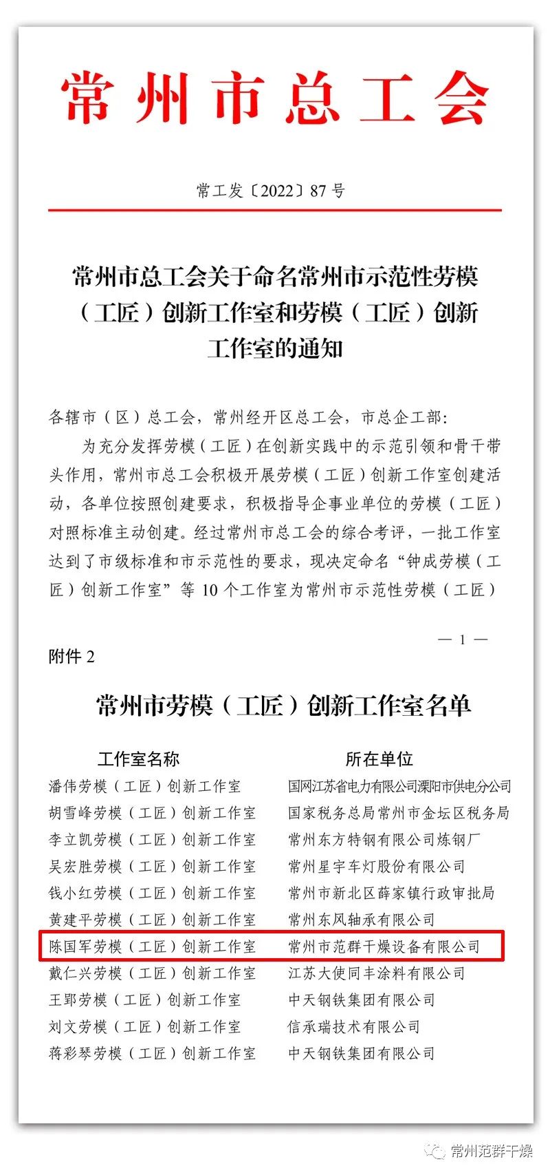 日前,常州市總工會公布17個常州市勞模(工匠)創(chuàng)新工作室名單,常州市范群干燥設備有限公司“陳國軍勞模(工匠)創(chuàng)新工作室”榜上有名。